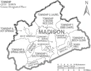 Madison is considered a "dry" county, meaning that the sale and/or public consumption of alcoholic beverages is illegal within the county limits. However, individual towns have right of self-determination regarding alcohol sales, and Hot Springs, Marshall and Mars Hill[18] all allow beer and wine sales, but not liquor.