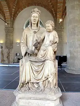 The Madonna of the Rose (Italian: Madonna della Rosa) is a 2.2 metre high marble sculpture of the Madonna and Child enthroned, with the Child trying to take a bunch of rosa canina from his mother's hand.[1] It forms part of a cycle of fourteen sculptures of the patron saints of the guilds of Florence on the external niches of the Orsanmichele church. No documents survive to precisely date it, leading to several theories and attributions. Most art historians attribute it to Pietro di Giovanni Tedesco, a German or Flemish sculptor active in Florence in the sculpture-yard of Florence Cathedral. It shows similarities to late works from the school of Giotto.