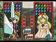 Magical Drop F: Daibōken Mo Rakujyanai![lower-alpha 1] is a 1999 puzzle video game developed by Sakata SAS and published by Data East for the PlayStation. It is the fourth entry in the Magical Drop series. In the game, the player takes control of one of several characters and battle against opponents. Gameplay is similar to previous entries but with the addition of an role-playing (RPG) mode; the player controls Justice on a journey to find seven Magical Drops scattered across the land, traveling villages and challenging characters in battles to obtain items and power-ups.