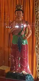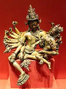 Present Maheśvara is Buddhist by religion, and was reborn as a Deva, because of his merit of donating a cup of honey to Kassapa Buddha in one of his previous lives. According to Karandavyuha Sutra, Maheśvara was born from the brow of Bodhisattva Avalokiteshvara.[1] According to Buddhist traditions, he helps good people, mostly who follow the Buddhist precepts and eat a vegetarian diet, and also punishes bad people for their evil deeds. He helps yogis doing Kundalini Meditation.[2][3] He is bodhisattva of Tenth Bhumi. He is one of the important deity venerated in Sri Lankan Buddhism. He is one of the twenty four protective deities of Chinese Buddhism and of the sixteen dharmapalas of Tibetan Buddhism.