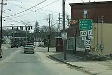 SR 11 and SR 121 proceed out of town to the southeast (both signed as "north"), meeting the southern terminus of SR 119 before entering Auburn and proceeding towards downtown on Minot Avenue. Signage posted at the intersection of Minot Avenue and Rotary Street (the latter of which also carries southbound US 202, SR 4, and SR 100 on a one-way pair) notes that this intersection is the end of SR 121.[2] However, per Maine Department of Transportation documentation, SR 121 continues north on Washington Street (the northbound direction for US 202, SR 4, SR 11, and SR 100), meets the southbound lanes at Minot Avenue, and ends at the intersection of Court Street, Union Street, and Minot Avenue.[1]