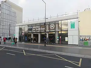 At the end of 2020, line 14 was extended by 5.9 km from Saint-Lazare to the station.[2] It's therefore the first connection between two Paris metro lines outside the capital.The construction of the Mairie de Saint-Ouen station was entrusted to the Bouygues TP, Solétanche Bachy France, Solétanche Bachy tunnel and CSM Bessac consortium. Structural work began in April 2015.[3] The platforms for line 14 opened on 14 December 2020.[4]