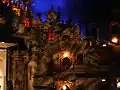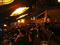 Theatre features included a huge cast-iron canopy covering the sidewalk, a vertical sign 76-feet tall topped with "a strutting peacock ... walking as a huge ball rotated under his feet," and a cave-like single-story lobby that included copper lanterns, ceiling murals, and an aquarium filled with tropical fish.[7] Inside the theatre's auditorium were stuffed birds perched on balconies or frozen mid-flight via ceiling wire, replicas of well-known Greek, Roman, and Renaissance sculptures, and specially treated cypress trees brought from Spain and placed on upper-level niches. The Baroque tendency to decorate with mask-like faces is exemplified by carvings alongside the stage and under the mezzanine balcony, and in direct translation of atmospheric theater design, the Majestic's blue ceiling "cloud scape" disguises the interior dome as an evening sky in conjunction with a cloud projector and small bulbs simulating stars. The bulbs are actually positioned according to consultations with experts at the National Geographic Society, who instructed the designer as to the positioning of the real stars on the night of the theater's opening.