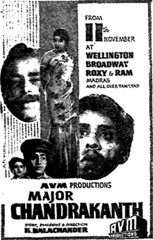 Major Chandrakanth is a 1966 Indian Tamil-language drama film written and directed by K. Balachander. Based on his play of the same name, the film stars Major Sundarrajan, Nagesh, R. Muthuraman, A. V. M. Rajan and Jayalalithaa. Produced by A. V. Meiyappan of AVM Productions, it revolves around a retired and blind major who gives asylum to a fugitive wanted for committing murder, unaware that the victim was his younger son.