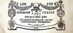 The Makhnovist ruble was produced by overprinting various banknotes of the states of the former Russian Empire, most often on the Don ruble issued by the Rostov office of the Don Republic's State Bank. There were a significant number of types of overprints. Some of them increased the denomination of banknotes by 10 times, others, which did not change the denomination of banknotes, carried the name of the Insurgent Army or its subdivision, or campaign and other texts. The Makhnovists did not issue their own paper banknotes. Full-fledged banknotes, allegedly printed and issued by the Insurgent Army, were found to be counterfeit.[1][2][3]