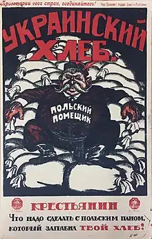However, the implementation of Bolshevik rule in Ukraine was soon followed by repression. As the Bolsheviks favored the proletariat over the peasantry, on 13 April, the Ukrainian Soviet government implemented food requisitioning in order to supply its urban centers, shooting any peasants that resisted, which caused a resurgence of peasant revolts in Ukraine.[67] The Cheka also carried out its Red Terror in the areas captured by the Bolsheviks, with residents of Katerynoslav reporting arbitrary political persecution and increased economic hardship.[68] Regiments of the Red Army even began to committ robberies against the local population and carried out a number of antisemitic pogroms, as part of a rising wave of violence against Ukrainian Jews that was perpetrated by the Reds, Whites and nationalists alike.[69] In comparison to the surrounding states, the Makhnovshchina "represented a relatively peaceful model", given the ethnically diverse makeup of the Makhnovists, who severely punished acts of antisemitism.[70]