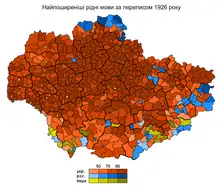 The different language policies of the various regimes that occupied Ukraine during the war of independence led to a number of shifts in the use of language throughout Zaporizhzhia. The Ukrainian State had prioritized the use of the Ukrainian language, enforcing its use in education,[171] and following the region's occupation by the Volunteer Army in June 1919, Vladimir May-Mayevsky banned the use of the Ukrainian language in schools throughout South Russia, instead enforcing the use of the Russian language.[172] In reaction to the linguistic restrictions enforced by the various preceding governments, after the Makhnovist victory over the White movement at the Battle of Peregonovka, the Makhnovshchina's "Cultural Enlightenment Section" declared that people were to be educated in whichever language was used by the local population, to be decided on voluntarily by the people themselves.[173] In the majority of villages and towns in the Makhnovist territory, this meant a return to the use of the Ukrainian language[174] and an end to the privileged status of the Russian language.[175]