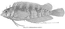 Malacoctenus macropus, the Rosy blenny, is a species of labrisomid blenny native to the Atlantic Ocean including the Gulf of Mexico and the Caribbean Sea from southern Florida and the Bahamas to the northern coast of South America. This species inhabits a wide range of habitats including patch reefs, seagrass beds and sponge beds. It can be found at depths of from near the surface to 8 metres (26 ft) though it is more rarely found deeper than 2 metres (6.6 ft). This species can reach a length of 5.5 centimetres (2.2 in) TL. It can also be found in the aquarium trade.[2]