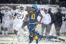 The 2017 Army–Navy Game saw Perry start at quarterback, though Navy went on to lose 14–13. In snowy conditions, he recorded 250 rushing yards on 30 attempts, including a 68-yard touchdown, but penalties on the final drive hampered the Midshipmen offense and resulted in Bennett Moehring's game-winning 48-yard field goal going wide left.[24] Perry's rushing yards accounted for 84 percent of his team's total yardage in the game and were nine more than Army's total.[25] The performance also allowed Perry to break 1,000 rushing yards in 2017; Abey also accomplished the feat, allowing Navy to have its third duo of 1,000-yard rushers in a season.[24] The Midshipmen, who started with a 5–0 record, concluded the regular season 6–6 and played in the Military Bowl against Virginia. Perry scored two touchdowns and rushed for 114 yards before leaving with a foot injury in the 49–7 victory.[26] The 114 rushing yards were the second-most in bowl history behind Reynolds' 144 in 2015.
