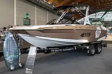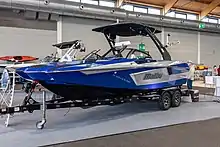 Malibu introduced the Axis Wake brand in 2009 as an "entry-level brand" that "doesn't have all of the electronics and bells and whistles that a Malibu does", such as having a manual wedge as compared to the electronically controlled wedge of Malibu models.[14] As of 2019, Malibu is marketing five models under the Axis Wake brand, the A20, A22, A24, T22, and T23, with the T23 selling between $65,000 and $100,000.[20] The Axis line has developed to changing consumer taste by incorporating highly sought after options such as Malibu's Surf Gate and Power Wedge III