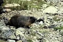 - Yellow-bellied marmot, Marmota flaviventris, montane and subalpine forests, meadows, alpine tundra, common