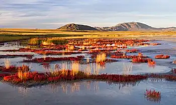 During the Holocene, the arid-adapted species became extinct or were reduced to minor habitats.[7] Cold and dry conditions similar to the last glacial period are found today in the eastern Altai-Sayan mountains of Central Eurasia,[45][1] with no significant changes occurring between the cold phase of the Pleistocene and the Holocene.[46][1] Recent paleo-biome reconstruction[47][48][1] and pollen analysis[49][50][51][1] suggest that some present-day Altai-Sayan areas could be considered the closest analogue to the mammoth steppe environment.[1] The environment of this region is thought to have been stable for the past 40,000 years. The Eastern part of the Altai-Sayan region forms a Last Glacial refugium. In both the Last Glacial and modern times, the eastern Altai-Sayan region has supported large herbivore and predator species adapted to the steppe, desert and alpine biomes where these biomes have not been separated by forest belts. None of the surviving Pleistocene mammals live in temperate forest, taiga, or tundra biomes. The areas of Ukok-Sailiugem in the southern Altai Republic and Khar Us Nuur and Uvs Nuur (Ubsunur Hollow) in western Mongolia have supported reindeer and saiga antelope since the glacial period.[1]