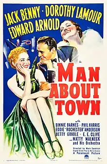 Man About Town is a 1939 musical comedy film starring Jack Benny, Dorothy Lamour, and Edward Arnold. The screenplay concerns a producer who tries to get his leading lady to take him seriously romantically by pursuing other women.