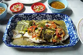 Food typical of Manado include tinutuan, a porridge consisting of various kinds of vegetables. In addition to tinutuan, there is cakalang fufu, a smoked skipjack (Katsuwonus pelamis), roa fish (exocoetidae or torani) Parexocoetus brachypterus, kawok which is food based from meat of the forest rodent white rat Maxomys hellwandii; paniki, bat meat-based dishes; such as (Pteropus pumilus) and rinte wuuk (abbreviated to RW) which is a local name of dog meat, swine pig (a pig is cooked by rotating on the embers), usually served at parties, and babi putar (made from pork mixed with Manado spices, rolled and burned in bamboo).