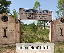 Kouroukan Fouga, or Kurukan Fuga, was the constitution of the Mali Empire created after the Battle of Krina (1235) by an assembly of nobles to create a government for the newly established empire, according to the Epic of Sundiata.[1] According to oral tradition of the griot poets of Mali and Guinea, the Kouroukan Fouga established the federation of Mandinka clans under one government, outlined how it would operate and established the laws by which the people would live. The name Kurukan Fuga is a toponym, translating to "clearing on granite/lateritic rock",[2] referring to the plain near the town of Ka-ba (present day Kangaba) where the narrative has Sundiata Keita present the charter.