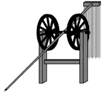 The first recorded use of mangonels was in ancient China. They were probably used by the Mohists as early as 4th century BC, descriptions of which can be found in the Mojing (compiled in the 4th century BC).[14][15] According to the Mojing, the mangonel was 5.2 metres (17 ft) high with four feet buried below ground, the fulcrum attached was constructed from the wheels of a cart, the throwing arm was 9.1 to 10.7 metres (30 to 35 ft) long with three quarters above the pivot and a quarter below to which the ropes are attached, and the sling 80 centimetres (2 ft 8 in) long. The range given for projectiles are 90, 50, and 40 metres (300, 180, and 120 ft). They were used as defensive weapons stationed on walls and sometimes hurled hollowed out logs filled with burning charcoal to destroy enemy siege works.[17][18] By the 1st century AD, commentators were interpreting other passages in texts such as the Zuo zhuan and Classic of Poetry as references to the mangonel: "the guai is 'a great arm of wood on which a stone is laid, and this by means of a device [ji] is shot off and so strikes down the enemy.'"[19] The Records of the Grand Historian say that "The flying stones weigh 12 catties and by devices [ji] are shot off 300 paces."[19] Mangonels went into decline during the Han dynasty due to long periods of peace but became a common siege weapon again during the Three Kingdoms period. They were commonly called stone-throwing machines, thunder carriages, and stone carriages in the following centuries. They were used as ship mounted weapons by 573 for attacking enemy fortifications.[20] It seems that during the early 7th century, improvements were made on mangonels, although it is not explicitly stated what. According to a stele in Barkul celebrating Tang Taizong's conquest of what is now Ejin Banner, the engineer Jiang Xingben made great advancements on mangonels that were unknown in ancient times. Jiang Xingben participated in the construction of siege engines for Taizong's campaigns against the Western Regions.[21]