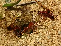 Manica rubida can reach a length of 5–9 millimetres (0.20–0.35 in) in workers, of 9.5–13 millimetres (0.37–0.51 in) in queens, of 8–10 millimetres (0.31–0.39 in) in males.[4] Workers are reddish brown, slender, usually with a darker head. Thorax and abdomen are very shiny and the abdomen is darker at the rear end. Queens are similar to workers, usually they have a slightly darker color than the worker, but often they are totally dark. Males are black and glossy. Queens and workers have a venomous sting and their stings are very painful, but not dangerous.[4]