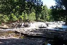 Manido Falls is a waterfall on the Presque Isle River and is located in the Porcupine Mountains Wilderness State Park in Gogebic County, Michigan. With a drop of approximately 15 feet, it is the smallest of the waterfalls on the river. It has a crest between 50 and 150 feet, depending on the river volume. It is above Manabezho Falls and further down from Nawadaha Falls. The name Manido comes from the Ojibway word meaning “spirit” or “ghost”. A view of the falls is easily accessible by trail.