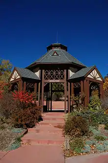 Medical practitioners, such as Dr. Edwin Solly, promoted the health benefits of the "pure air" and sunny Rocky Mountain climate as the "world's best suited therapeutic environment" for the treatment of tuberculosis.[15] He also believed in the benefits of mineral spring water which drew tourists and the infirm, particularly people with tuberculosis, to the area. Some springs were enclosed as the town grew. One of the enclosures, in red sandstone and under a "conical roofed structure", is the Cheyenne Spring House. There were more than 50 drilled wells and springs after the turn of the century. Since then, more were enclosed. After a period when the town's popularity diminished, some springs were closed, capped or paved over. Then the Mineral Springs Foundation was formed in 1987 to restore some of the springs and promote the benefits of the town's spring water. Walking tours of the town's springs are called "Springabouts".[5][8][9]