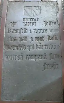 John Bampfield (son) (fl. 14th century), who married Agnes Pederton, daughter and heiress of John Pederton of Hardington,[22] Somerset, by his wife Cecilia Turney, daughter and heiress of John Turney. By his wife he had two sons, the eldest Sir William Bampfield of Poltimore, the youngest Peter Bampfield of Hardington, Somerset. Bamfield and his wife Agnes Pederton rebuilt the Parish Church of Poltimore, as is evidenced by an inscribed ledgerstone, said by Worthy (1896) to have been moved from the nave to the chancel, bearing the following Latin text:[9]