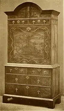 From the 1850s, changes in distribution and marketing occurred which divided London into the retail district in the West End and the wholesale market of the East End.[7] While at the end of the 18th century much of London's furniture was crafted in the West End, throughout the 19th century this experienced a shift and by the 1870s a market for less expensive goods led to large production from the East End. More of the West End retail companies began to outsource their goods and "by the late 1880s, for instance, Maple & Co. made less than 10 per cent of the goods they sold under their own label".[8] One of the suppliers that produced bedroom and dining cabinets for Maple was Harris Lebus, a prolific East End furniture manufacturer.[9]