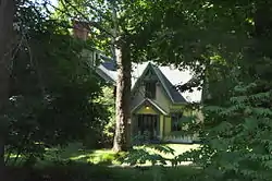 Maplewood Farm consists of several parcels of land, organized in a long strip that is roughly bisected by River Road, and whose western edge is the Presumpscot River. Most of this land is now wooded, the principal exception being a large clearing in which the farm's buildings are located, set at a remove from the southwest side of River Road. The main house is a c. 1770 two story wood-frame structure, which underwent significant alterations in about 1850 to give it its present Gothic Revival appearance, with steeply pitched gables, bargeboard decoration, and lancet-arched windows. Also surviving from the mid-19th century are two barns and a small cottage. The small Anderson family cemetery is set near the road, southeast of the building complex.[2]