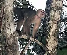 The Marañón white-fronted capuchin lives in wet forests of the upper Amazon basin in southern Colombia, eastern Ecuador, northeastern Peru and likely eastern Brazil.[2][3] Males have a head and body length of about 43 cm (17 in) with a tail length of about 47 cm (19 in).[2] Females have a head and body length about 37 cm (15 in) with a tail length of about 45 cm (18 in).[2]
