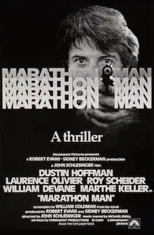 Marathon Man is a 1976 American thriller film directed by John Schlesinger. It was adapted by William Goldman from his 1974 novel of the same title and stars Dustin Hoffman, Laurence Olivier, Roy Scheider, William Devane and Marthe Keller. In the film, "Babe" Levy, a graduate student (Hoffman), becomes embroiled in a plot by Nazi war criminal Christian Szell (Olivier) to retrieve stolen diamonds from a safe deposit box owned by Szell's dead brother. Babe becomes unwittingly involved due to his brother Doc's (Scheider) dealings with Szell. It was a critical and box office success, with Olivier earning an Oscar nomination for Best Supporting Actor for his role as Szell, the film's antagonist.
