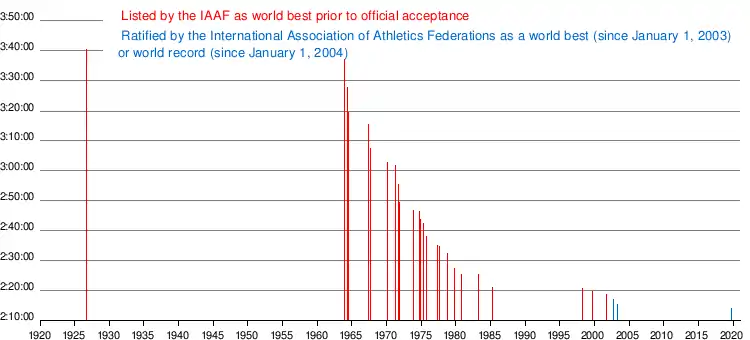 | 2:12:00 | Morio Shigematsu | June 12, 1965 | Polytechnic Marathon | IAAF[53] | Point-to-point course. Report in The Times claiming world record.[77] | |