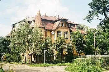 Part of the estate of Maraunenhof was transferred from the rural district of Königsberg (Landkreis Königsberg i. Pr.) into the city of Königsberg (Stadtkreis Königsberg i. Pr) on 1 April 1905, with the remainder following on 10 June 1927. A break was made in Königsberg's city walls near the Wrangel Tower (Wrangelturm) in 1906 to allow construction of a road north through Tragheimsdorf to Maraunenhof. The Königsberger Terrain-Aktiengesellschaft Oberteich-Marauenhof, a private development company, built Maraunenhof into a suburb of upper class villas along the northern shore of the Oberteich ca. 1911.[4] Parks in Maraunenhof included Max-Aschmann-Park, named after the merchant Max Aschmann,[5] and the scenic Stadtgärtnerei, established by Garden Inspector Paul Käber (1869-1919).