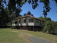 A new teacher's residence was built at Marburg Rural School in 1926 for £1145.[28] It was located on the eastern side of the site and faced south toward the entry driveway. The 1926 plan shows the residence as a highset structure, with an 8 feet (2.4 m)front verandah and a 10 feet (3.0 m) rear verandah - the rear verandah was enclosed with weatherboard cladding and casement windows. Southern and eastern stairs accessed the front and rear verandahs, respectively. The interior comprised a core of three bedrooms and a dining room arranged around a central hallway; and a rear wing included a kitchen with stove alcove, pantry, bathroom, and servant's room. The understorey housed a wash house (below the kitchen).[31] In the same year, a fence was constructed around the residence and the understorey was enclosed with battens.[32][1]