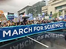 The March for Science (formerly known as the Scientists' March on Washington)[6] is an international series of rallies and marches held on Earth Day. The inaugural march was held on April 22, 2017, in Washington, D.C., and more than 600 other cities across the world.[7][8][9][10][11] According to organizers, the march is a non-partisan movement to celebrate science and the role it plays in everyday lives.[12] The goals of the marches and rallies were to emphasize that science upholds the common good and to call for evidence-based policy in the public's best interest.[11][13] The March for Science organizers, estimated global attendance at 1.07 million, with 100,000 participants estimated for the main March in Washington, D.C., 70,000 in Boston, 60,000 in Chicago, 50,000 in Los Angeles, 50,000 in San Francisco,[14] 20,000 in Seattle, 14,000 in Phoenix, and 11,000 in Berlin.[15]