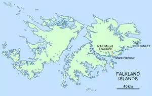Mare Harbour, known colloquially as East Cove Port, is a small settlement on East Falkland, on Choiseul Sound. It is mostly used as a port facility and depot for RAF Mount Pleasant,[1] as well as a deepwater port used by the Royal Navy ships patrolling the South Atlantic and Antarctica, which means that the main harbour of the islands, Stanley Harbour tends to deal with commercial transport.