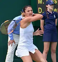 Gasparyan returned stronger during the grass-court season, upsetting seventh seed Viktória Kužmová in the first round of the Rosmalen Grass Court Championships.[24] She then stunned Elina Svitolina for her first top-10 win of the year at the Birmingham Classic.[25] At Wimbledon, she was close to repeating her victory over Svitolina in the second round but was forced to retire in the second set.[26]