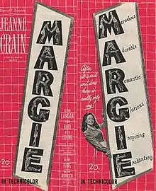 Margie is a 1946 American romantic comedy film directed by Henry King and starring Jeanne Crain, about a high school girl in the 1920s who develops a crush on her French teacher. Margie was a box-office hit, ranking in the top 15 highest-grossing films of the year,[4] and established Crain as an important Fox star.[5] Although not a true movie musical (as it uses period recordings, with only one song being partially performed by a character in the film), it is sometimes classified with musicals due to the large number of 1920s-era popular songs incorporated as nostalgic background in the film.[6]