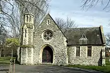 The cemetery contains a number of distinctive monuments, three of which are listed buildings. Most striking is the green bronze memorial to George Broad, who owned the foundry which made the Eros statue at Piccadilly Circus. Nearest Charing Cross Hospital, the Young family mausoleum is a single-storey building in Gothic architecture style.[3] The third listed grave is that of an Australian gold prospector, with a bas relief of him, opposite the Young family mausoleum.