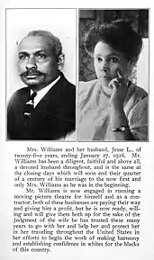 In 1916, Williams also married entrepreneur Jesse L. Williams, who owned a movie theater among several other businesses in Kansas City.[5] The pair co-managed the movie theater, which gave the couple experience in the distribution and release of films for African-American audiences.[5] With Williams serving both as the company's secretary and treasurer, the couple went on to co-found Western Film Producing Co. and Booking Exchange,[5] and Williams went on to write the script for Flames of Wrath, produce a film from the script and play the role of prosecuting attorney in the five-reel film.[1][4] That same year, Williams' husband died, and she soon went on to marry another man.[4] She died in 1932, after being "called away from her home by a stranger who requested help for his ill brother.[4] She was found shot to death on the side of a road several miles from her home. The murder remains unsolved."[4]
