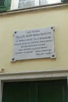 Maria Repetto (1 November 1807 – 5 January 1890) was an Italian Roman Catholic professed religious from the Sisters of Our Lady of Refuge in Mount Calvary.[1] Repetto was an ardent devotee of Saint Joseph and promoted devotion to him while distributing medals and images of him to those who visited the convent she was at; she also distinguished herself as an able carer for cholera victims on two occasions of epidemic.[2]