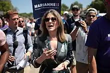 Williamson's performance in the first debate was the subject of mockery for several statements. She claimed that her "first call [as President would be] to the prime minister of New Zealand," to say "girlfriend, you are so on...the United States of America is going to be the best place in the world for a child to grow up" , which led to widespread mockery in New Zealand and was labelled "bizarre" by The New Zealand Herald.[25] This, and her assertion that she would "harness love for political purposes" against Donald Trump,[26] made her the subject of many Internet memes.[27] The memes also led Republicans including Ted Cruz strategist Jeff Roe to call for donations to her campaign, to keep her on the stage for future debates to sideline the more likely candidates in favor of her.[28] Williamson subsequently drew praise for challenging libertarianism on The Rubin Report.[29] Her campaign was noted for receiving 70% of its funding from women. This was 13% higher than that of Julian Castro, the candidate with the next highest fraction of female support.[30]