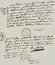 Marie-Aurore wrote to her friend, François Robin de Scévole about the death of Maurice. The letter was wrongfully dated 12 September 1808, when Maurice died on 16 September. Marie-Aurore's tears leave traces on the paper.[19] Her seal in the header of the letter, is black:[20]