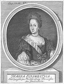 Marie Elisabeth, Duchess of Mecklenburg (24 March 1646 - 27 April 1713) was a princess of Mecklenburg-Schwerin. In 1712, following the unplanned late pregnancy and ensuing resignation of the formidable incumbent, Henriette Christine of Braunschweig-Wolfenbüttel, Marie Elisabeth became Princess Abbess of Gandersheim Abbey, but she died the next year.[1][2][3]