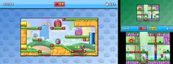 Tipping Stars returns to the two-dimensional side view present in installments prior to Minis on the Move, and uses Mini-Land Mayhem gameplay. Using the 3DS' touchscreen or the Wii U gamepad, the player guides the Minis through levels within the shortest and best way possible. To achieve this, players are given up to four items to craft the Minis' ways such as red pathways or springs and keep them close. Once the Minis has reached the Goal Door, the remaining time is transferred to the final score, which determinates the trophy and amount of stars. If the Minis enter contact with hazards, such as enemies or spikes, the time limit is reached, or a Mini is left behind, the game is over. Bosses are removed and replaced by a natural level in which a Cursed Mini Mario wanders. When all levels are cleared, two extras world re unlocked, as well as three Bonus worlds which is gradually unlocked by the numbers of gold trophies obtained. Both versions contain the same levels, though minor changes in the level design has been brought to fit in the 3DS' touchscreen.