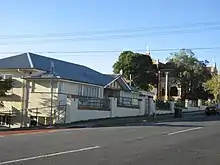 Adjacent to the school are a number of Catholic buildings still owned by the Parish. At 369 Given Terrace stands the large red brick Sacred Heart Church, built in 1917. Immediately across the road at 333 Given Terrace is the "Sacred Heart Primary School" (consisting of 5 small buildings) for grades 1–7, now closed but used by other Catholic groups. Behind that is a brick community hall constructed in 1978. There is also a parish priest residence on Given Terrace and a smaller building on the corner of Fernberg Road and Given Terrace that stands where the parish’s original wooden church stood. The original wooden church was constructed and formally blessed by Archbishop Robert Dunne on 10 March 1907 and was used until the large brick church was built in 1917, and thereafter it was used for primary school schooling until it burnt down in the 1970s. Finally at 327 Given Terrace there is the Sacred Heart Convent built in 1918 which was owned and used by the Sisters of Mercy order of nuns (who had commenced teaching in the parish in 1905) until sold by them in 2005. All of these premises have been utilised by the Marist Brothers High School when the need arises.