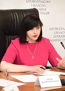 Mariya Volodymyrivna Chorna (Ukrainian: Марія Володимирівна Чорна; born in 26 August 1974), is a Ukrainian politician and statesman who had served as the Governor of Kirovohrad Oblast from 2021 to 2022.[1]