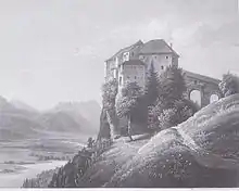 When Pernhart's drawing style had fully developed, he was asked by Max von Moro to draw all of the castles and palaces in Carinthia. The idea was to preserve these buildings, if not in physical form due to financial reasons, at least through pictures and so then keep them from decay. Markus Pernhart did not disappoint his client and recorded the smallest details in pencil drawings of the well-preserved facilities, but also of the partly dilapidated ones as well. As early as 1853, he made up to 40 drawings, later on reaching 198, which are now in the property of the History Association for Carinthia. In 1855 the Carinthian estates gave Empress Elisabeth of Austria-Hungary an album with 21 drawings, to which Max Moro contributed the explanations. Under the title Pictures from Carinthia they appeared in deliveries between 1863 and 1868 as steel engravings with accompanying texts. After his death, five lithographic panorama pictures were published (Klagenfurt, 1875 and 1889).[1][6]