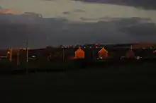 After closure, the headgears and other machinery at Marley Hill Colliery were scrapped and the buildings levelled. A hole was knocked into the wall of the square building which enclosed the top of the upcast shaft, and the rubble from the rest of the buildings tipped in to backfill it. This process having been completed, the building was demolished and a large concrete cap placed over the mouth of each shaft. There appear to be only two remaining buildings directly associated with the colliery. One of these is an airlock above a backfilled ventilation shaft from the Clockburn Drift, hidden away in Clockburn Wood near Whickham. The shaft was known as the Hollinside Shaft and actually pre-dates the drift as it was originally part of Axwell Park Colliery,[17] which was situated roughly a mile to the north-east. This colliery closed in 1954 after men from Marley Hill began working its remaining reserves beneath Hollinside and Gibside via the drift, at which point the NCB installed a fan to aid ventilation, these workings being some distance from the Shafts at Marley Hill Colliery itself. The other remaining structure is a curious rendered brick hut with double-walled construction and heavy steel doors, which stands in the middle of a field to the south of St. Cuthbert's Park. It is best to consult Google Earth to pinpoint the location. This is the colliery's former powder magazine, where explosives for use underground were stored. It was presumably constructed sometime in the first couple of years of the 20th century, as the bricks used, which bear the name "Blythe & Sons, Birtley Station" along with the letters ER (Edward VII) and the date 1901, are of the same type (stamped 1903 and 1904) used to construct Church Street, Cuthbert Street and Glamis Terrace. It has evidently been designed to direct the force of any explosion upwards, with its isolated location meaning that the resulting debris would not land on the surrounding houses or colliery buildings. It is (for unknown reasons) sometimes referred to locally as "the butterfly chambers" and fell out of use some time before the colliery closed, with one former Marley Hill miner recalling playing in it as a child. A new explosives store was built to replace it, this building being situated near the pit head baths.