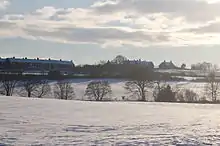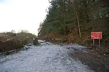 There was an anti-aircraft battery near High Marley Hill during World War II, and a drift mine which closed in the 1960s, as did the nearby Byermoor Colliery.[18] The 1951 OS map shows an opencast mine in the field beside the road, near the farm (marked on the map as Longfield House) and there is an embankment which runs parallel to School House Lane, from the site of the drift to the remains of a large retaining wall. This was presumably a loading point on the Bowes Railway, the trackbed of which is still visible, running alongside St. Cuthbert's Road. The presence of a large flat area of waste ground on the opposite side of the road to the wall is a possible indication there were railway sidings here. It is not known whether this loading point also handled the output of the opencast. The 1951 map also shows a terrace called Waggonway Row just beside the retaining wall. The outline of these houses can be seen from the air and is visible on Google Maps. The large house on School House Lane has several outbuildings which appear to have been associated with the drift. This would explain the presence of a sign on the wall of the building nearest the road which reads "UK Coal Monitoring Station." Exactly what this is monitoring is unclear, although it is likely to be mine water or gas. School House Lane forms the southern end of St. Cuthbert's Road, and vehicular access beyond the large house is prevented by a large concrete block which has been placed in the centre of the lane.