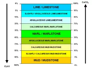 Scheme of the transitional lithotypes from mud (or mudstone) to lime (or limestone), illustrating the definition of marl (marlstone) as a mix of calcium carbonate and clay