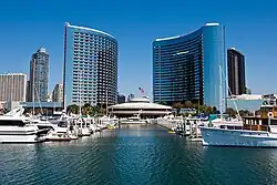The Marriott Marquis San Diego Marina is a hotel in San Diego, California. In the Marina district of Downtown San Diego, the hotel is composed of two towers of equal height. The two towers are the 20th tallest buildings in San Diego and are a prominent fixture in the city's skyline. The 25-story towers have a height of 361 ft (110 m) and contain 1,362 rooms. The hotel is affiliated with Marriott Hotels & Resorts.