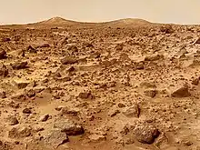 Finding an adequate landing site means being able to estimate rock size from orbit. The technology to accurately determine rock size under 0.5 meters in diameter from orbit has not yet been developed, so instead rock size distribution is inferred from its relationship to thermal inertia, based on thermal response of the landing site measured by satellites currently orbiting Mars. The Mars Reconnaissance Orbiter also helps this cause in the sense that its cameras can see rocks larger than 0.5 m in diameter.[14] Along with the possibility of the lander tipping over on sloped surfaces, large topographical features like hills, mesas, craters and trenches pose the problem of interference with ground sensors. Radar and Doppler radar can falsely measure altitude during descent and the algorithms that target the touchdown point of the lander can be "tricked" into releasing the lander too early or late if the craft passes over mesas or trenches while descending.[14]